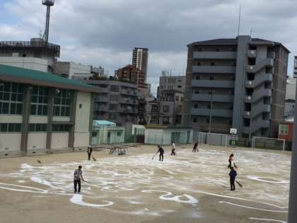 5月9日(水)PTA予算総会の前に教職員が運動場ににがりをまきました。
