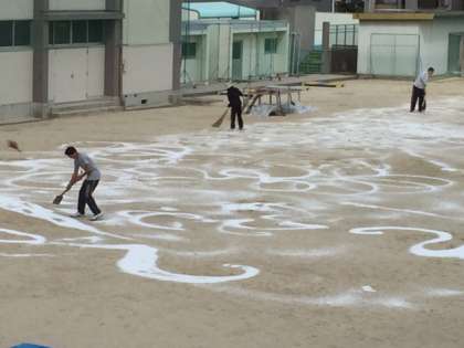 砂埃がたたない最高の状態で練習を行えるようにと、遠足から帰ったばかりの低学年の教員も参加して管理作業員、体育主任の指示のもと手際よく作業が進められました。