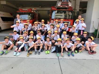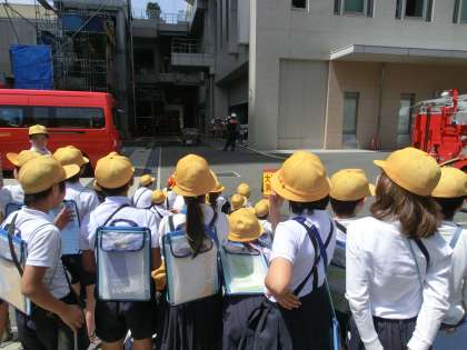 5月15日、社会科見学で大阪市消防局に行きました。ホールで消防署で働く方の仕事や、消防車の種類・金額などについて話をしていただいた後、実際に119番通報を代表2人が体験しました。