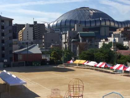 九条東小学校と九条北小学校から森前会長、中山会長がテントを借りてきてくださり、教職員が昨日張りました。