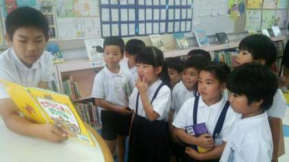 20分休みの図書館開放の時間に「読み聞かせをはじめます!聞きたい人は集まってください!」と6年生の図書委員さんの元気な声が聞こえます。目を輝かせて集まってきたのは1年生の子どもたち。