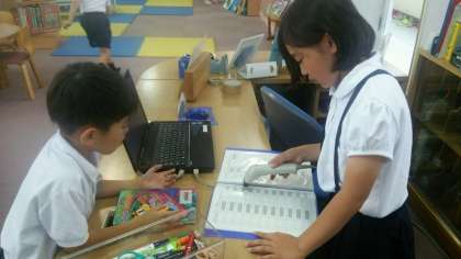 曜日ごとに決まったメンバーが図書当番活動に参加し、貸出返却の手続きでバーコードを読み取ったり、図書館開放に来た人数の集計を取ったりしています。今年度から委員会活動に初めて参加している4年生も頑張っています。