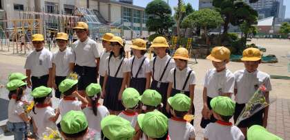 今年も、おとなりの福音幼稚園のお友達が、九条南小学校に来て、素敵なお花のプレゼントを届けてくれました。一人一人がかわいらしい花束を、運営委員のメンバーに手渡ししてくれました。「素敵なプレゼントありがとうございます。」「これからもよろしくおねがいします。」お互いにしっかりあいさつをして、かわいい花束を受け取りました。