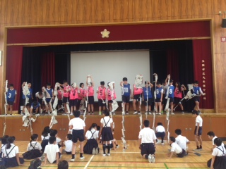 今回のイングリッシュタイムは、元気に正しく発音できるか奇数学年と偶数学年で勝負しました。ちょっと照れている高学年の児童も低学年の元気な声におされて、みんなでしっかり発音しました。
