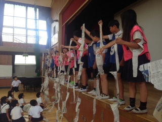 児童集会は「新聞ちぎりゲーム」でした。たて割り班のみんなで新聞紙1枚をどれだけ長くちぎれるか勝負しました。一番長かった班にみんなで拍手!
