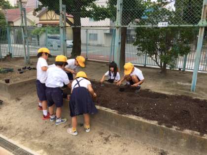 5月にあさがおの種を植えた時、地域の教育活動支援ボランティアの皆様に教えていただいた、人さし指で穴をあけて種を入れ、土のお布団をそっとかけるということを、1年生の子どもたちはしっかり覚えていました。