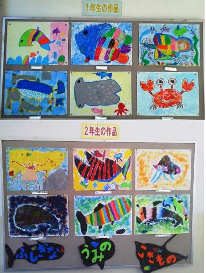 しっかり塗りこんで生き生きと表現した絵や工夫を凝らしたカラフルな工作、細かい作業で彩色したり切り抜いたりした作品など、どの学年の作品も集中して取り組んだことがうかがえます。