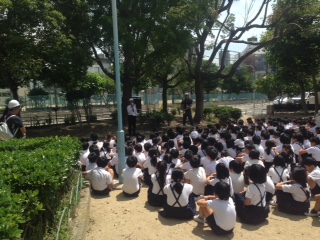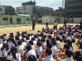 子どもたちは「お・は・し・も」を守りながら、3分以内に全員が運動場へ避難することができました。