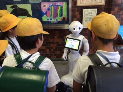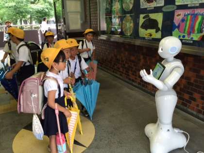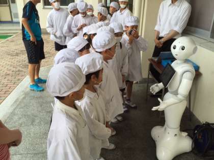 登校時には門に立ち、子ども達にあいさつをしていました。「おはよう」とペッパーくんに話しかけると、ペッパーくんから「おはよう。今日も1日がんばろう。」「おはようさん。今日も張り切っていこう。」など9パターンの声かけをランダムにしてくれました。ペッパー君に、子ども達は朝から元気をたくさんもらっていました。
