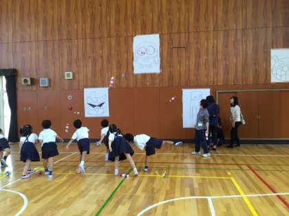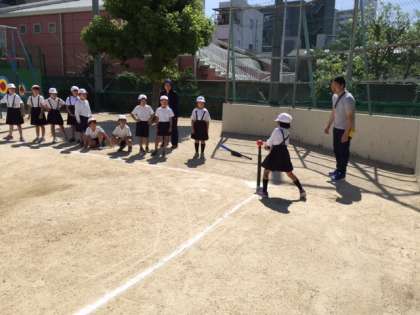 低学年の「遊びに行くDAY」では、前半は、「投げる・打つ」の活動を行いました。ティーを使ったバッティングやキャッチボール、ボールやドッジビーの的当てを保護者の方の的確なアドバイスをもらいながら、子どもたちは楽しく行うことができていました。