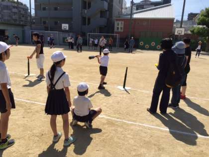 後半の2・3年生は、ティーベースボールで子ども対大人の対戦をしました。普段ボールで遊ぶことの少ない子どもたちは大はしゃぎでした。