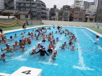 低学年のプール開きには、6年生が一緒に参加してサポートをしてくれました。おんぶでお散歩をしたり、ジャンケンゲームや追っかけゲームをしたり、1年生は、心強いサポーターがいて、安心して水遊びを楽しむことができました。