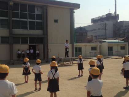 梅雨の晴れ間なのか、朝からギラギラと太陽が光る中、久しぶりに運動場で全校朝会をおこないました。