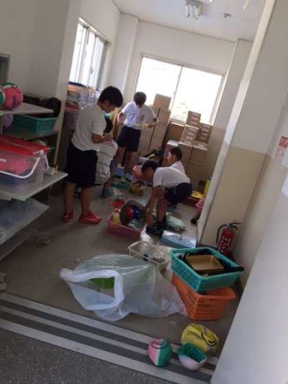 運動委員会は、プール水泳で体育用具を使用する機会が少ないこの時期に整理整頓を頑張ろうと話し合い、体育倉庫や職員室前の体育用具の整理整頓をしていました。