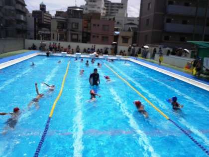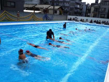 4年生代表が前に出て準備運動スタート。水慣れをした後、3つのコースに分かれてそれぞれの目標に向かって練習しました。最後の振り返りでは、「底のラインを見て真っ直ぐ泳げるようになった」や「息継ぎができるようになった」など1時間の学びを発表していました。これから夏本番。しっかりと練習してまた9月に成長した姿をお見せできるようにします。