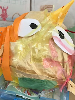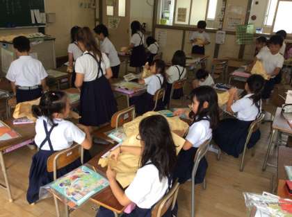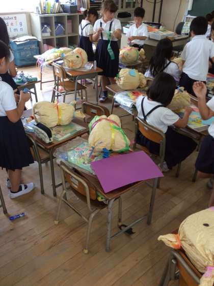 くしゃくしゃにした紙袋の中に新聞紙をいれて紐でくくり、耳にしたり、体にしたり思い思いのかわいい「友だち」を作りました。紙の袋をくしゃくしゃにすると「まるで布みたい。」「やわらかい。」子どもたちからは、さまざまなつぶやきが聞こえました。できあがった「友だち」を抱っこしながら話しかける姿は、とてもかわいかったです。