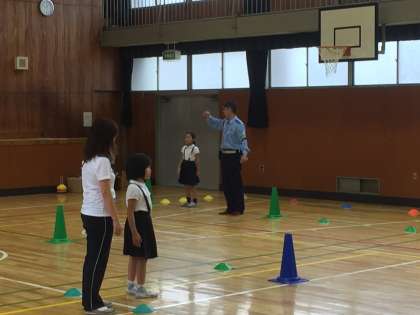 右左右を確認して交差点を渡る。車道と反対側を歩くなど安全に歩行するポイントを確認し、模擬道路を歩いてみました。「はらぶったあべさ」は自転車の点検合言葉です。ぜひおうちで合言葉の話を聞いてあげてください。