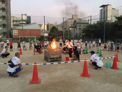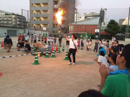 子どもたちの安全面に気をつけ、大勢の大人がファイヤーを取り囲む中、リーダーの杉本子ども会会長のリードのもと、歌やゲームなどスタンツを楽しんでいました。