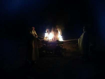 火の神の登場、火の神の話に集中して聞き入り、厳かに点火が行われました。