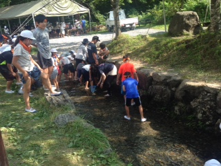 冷たい小川で魚を素手でつかみます。魚も捕まらないようにと必死に泳ぐため、簡単にはつかめません。