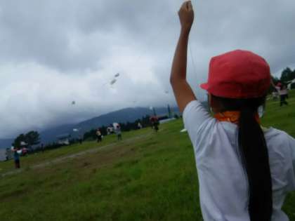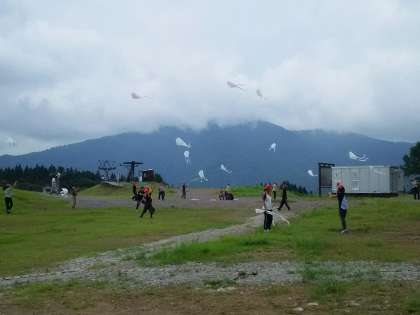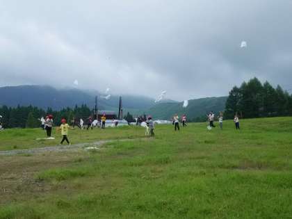高原を縦横無尽に駆け回り凧を揚げようとする児童、少し揚がると糸の巧みな操作でどんどん空高く上げていく児童、最初は様々でしたが、試行錯誤する中でみんなが大空に凧を上手に揚げることができました。