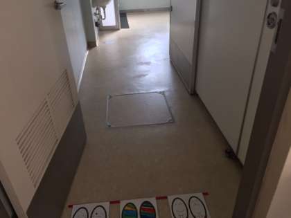くろずみが水だけでは落としきれないため、夏季休業日中に特殊な効用の洗剤を使い、トイレの清掃をしています。