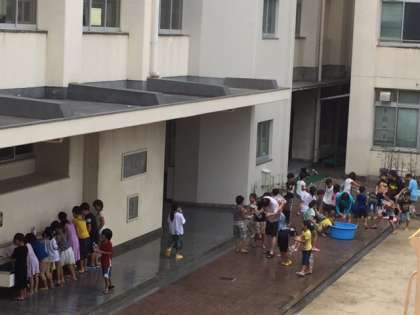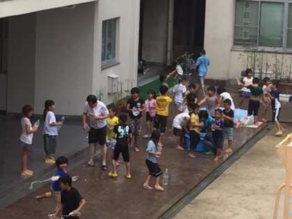 子どもたちの元気な声が、聞こえてきました。早速、窓からのぞいてみると、「いきいき放課後活動」で水遊びをしていました。
