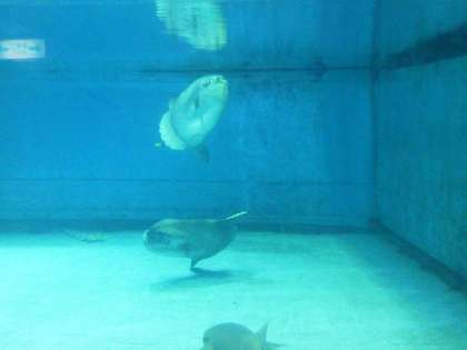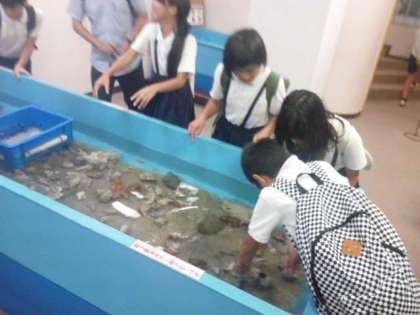 たくさんのマグロが円形水槽を回遊するダイナミックな様子やマンボウが泳ぐ水槽に見入っている児童も多かったです。