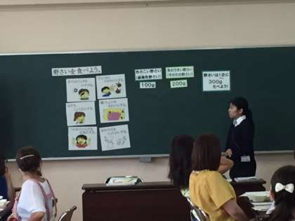 栄養教諭からは、給食についての話と「野菜を食べよう」という栄養指導もしていただきました。