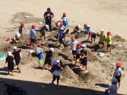 穴を掘ったり、上に積み上げたり、並べたり、何かに見立て型抜きを繰り返したり、机上ではできないダイナミックな活動を存分に楽しんでいました。