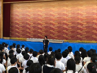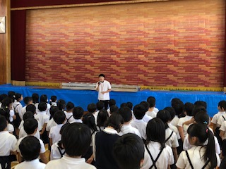 今日は、2時間遅れの登校となり、10時半から全校朝会をおこないました。