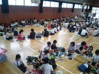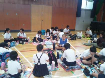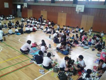 全校オリエンテーリングが延期になり、各教室でお弁当を食べる予定でしたが、「まだ雨降ってないよ。」と残念がる児童が多かったので、今日は、たてわり班でお弁当を食べることにしました。