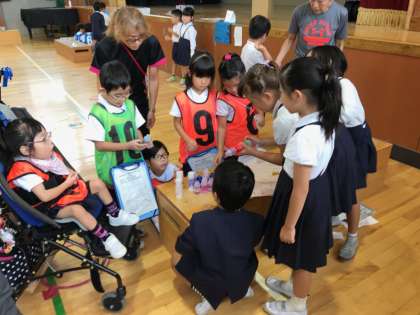 1年生を招いた2時間目のパーティーは、お客さんを前にして緊張した面持ちの2年生、そして目の前にずらりと並んだ手作りおもちゃの数々に目を輝かせている1年生それぞれがルールを守って楽しく活動していました。