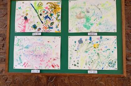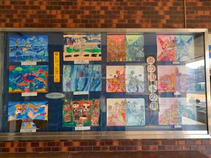 校内の掲示板には、子どもたちの絵画が掲示されています。
