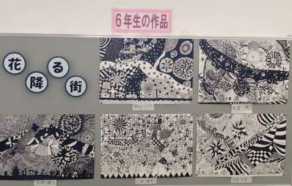 6年生「花降る街」は、サインペンの黒と画用紙の白のコントラストを使い、各自がイメージする花の街を表現しています。構図や花の形、花の大小によって多様な作品が完成し、見ごたえがあります。