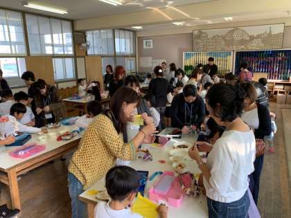 一年生の参観では、あさがおのつるでリースを作りました。夏の間に、きれいな花を咲かせてくれたあさがお。種とつるだけが残って、少し寂しかったのですが、子どもたちの思い思いの素敵な飾りで、もう一度花が咲きました。どれも力作ばかり。最後には、みんなの作品を鑑賞し、楽しい1時間となりました。