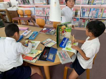 1年生の児童は、自分の愛読書を可愛い絵と文で紹介しました。