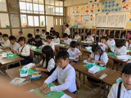 1年生は、1学期に図画工作科で学習した伸ばす・ひねる・丸める・つまみ出すなどの技法を使い、「美味しいお弁当をつくろう」という学習をしました。