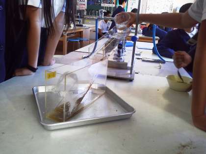 流れる水の働きで、どのように地層ができるのか、写真などで見るだけでなく、実際に流された砂や土がどのように堆積していくのかを実験しました。