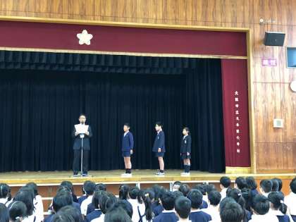 夏休みに取り組んだ「自由研究」の作品を4・5・6年生から1点ずつ出品し、見事3人に賞状が届き、火曜日の全校朝会で表彰しました。