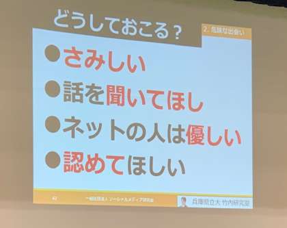 また、大手携帯会社のスマホには既にフィルタリング機能は、法律に基づき入っているので、活用法を学ぶと良いこと、危険防止用のソフトも販売されていることも教えていただきました。