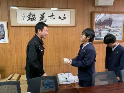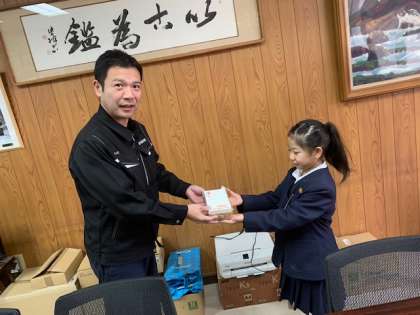 役友会会長 村井耕太郎様から教育年賀を受け取った子どもたちは、「大切に使います。」「心を込めてかきます。」「これからも私たちを見守ってください。」などの感謝の言葉をしっかり伝えていました。