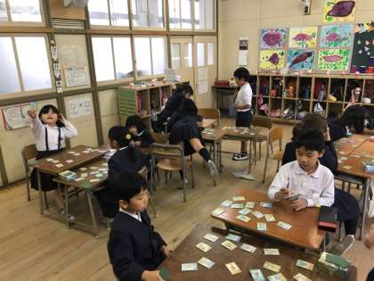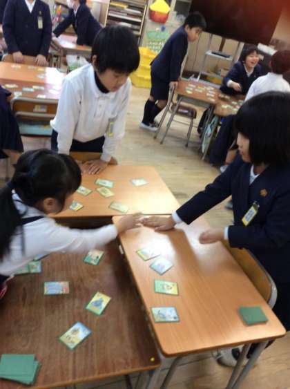 本日3・4時間目にかるた大会をしました。初めは「ゐ」や「ゑ」といった昔の仮名に戸惑っていましたが、何度か回数を重ねるうちに「そのことわざ聞いたことある!」「難しいほうの平仮名や!」という声とともに楽しそうな表情がたくさん見られるようになりました。