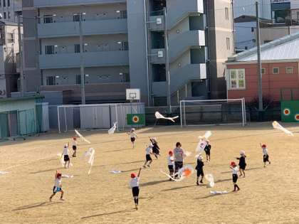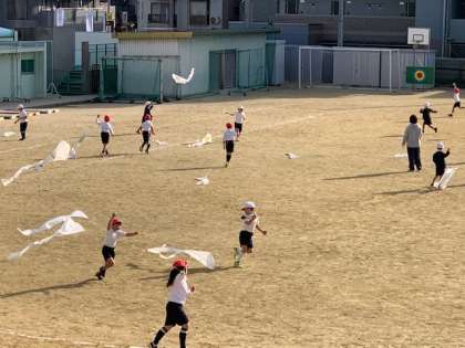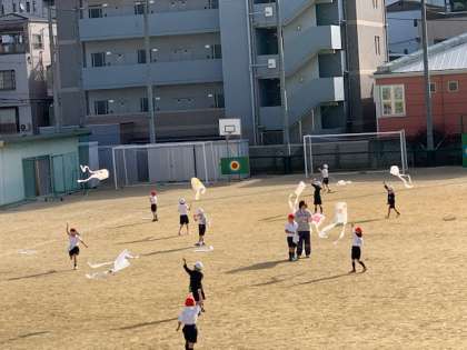 図画工作科で作成した凧を使って、1年生の児童が凧揚げを楽しんでいます。