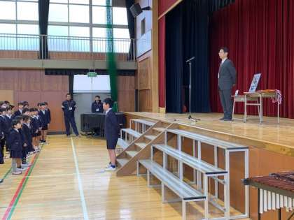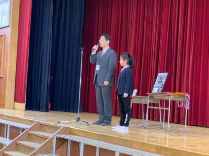 次の朗報は、立派な盾やメダル、表彰状が届いたことでした。校長先生から全校児童の前で活躍について称賛していただき、授与式を行いました。