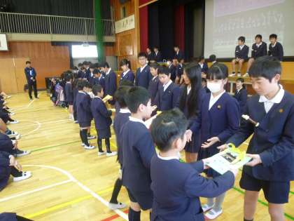 たてわり班や登校班などでお世話になった6年生へ、1年生から5年生がメッセージをかいて渡しました。