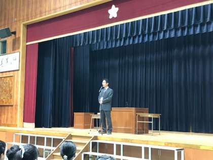 堀尾校長先生から、8年前の2011年3月11日に地震が起きたこと、亡くなられた方や行方不明なっている方がたくさんいること、今なお5万人の人たちが避難生活を送っていることについてお話がありました。