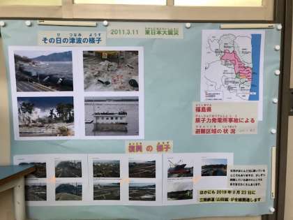 校長室前には、東日本大震災が起きた時の津波の様子や復興の様子などを掲示しています。ぜひ、見てほしいと思います。