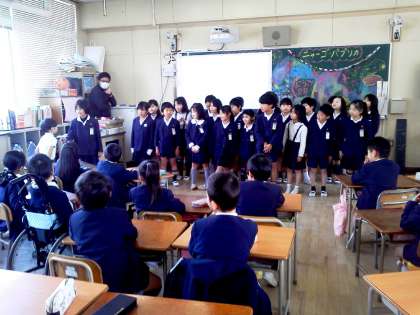 紙しばいが終わった後は1・2年生全員でパプリカを歌ったり踊ったりしました。1年生のみなさんも前で自信をもって踊るお兄さんお姉さんの姿を見て見よう見まねで踊っていました。2年生の国語科の学習の締めくくりとして児童一人一人が自信を持つことができる発表会になりました。