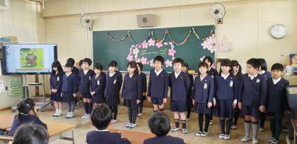 今日の2時間目に1年生を招いて国語科「ニャーゴ」の音読紙しばいの発表をしました。初めは緊張した面持ちでしたが、1年生の「これから何が始まるんだろう。」「2年生の発表ってどんなのかな。」といったわくわくした表情を見ると、気持ちを切り替えて2年生のお兄さんお姉さんらしく堂々と発表することができました。ねこのたまの『ニャーゴ』という鳴き声を場面に応じて工夫した声で表情豊かに表現していました。司会やはじめの言葉、おわりの言葉を担当した児童も1年生の前で大きな声ではっきりと話すことができました。